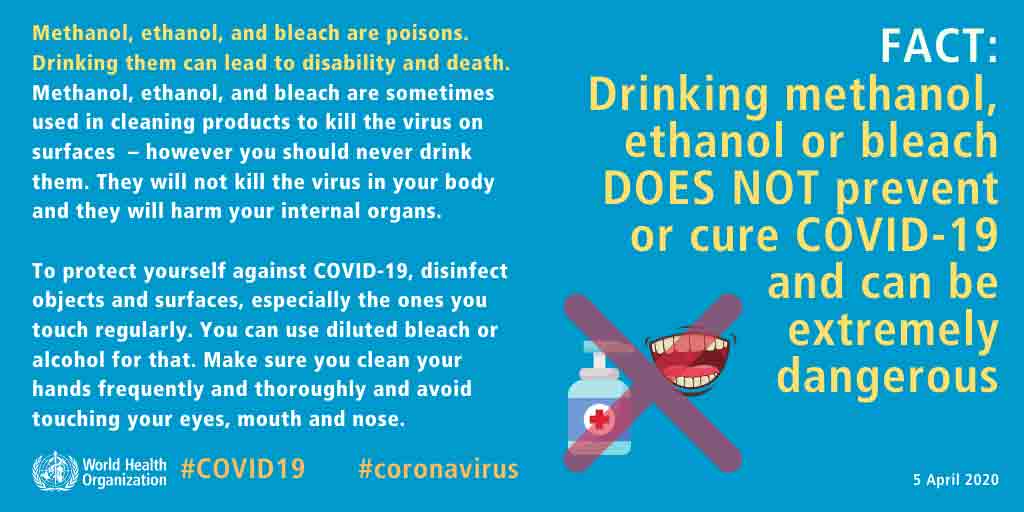പ്രതലങ്ങൾ ശുചീകരിക്കാൻ മാത്രമേ അണുനാശിനികളും ബ്ലീച്ചിങ് പൗഡറും ഉപയോഗിക്കാൻ പാടുള്ളൂ. ഇവ ശരീരത്തിന് വിഷാംശമാണെന്നും തൊലിപ്പുറത്തും കണ്ണിനും തകരാർ സംഭവിക്കാനിടയാക്കുമെന്നും ലോകാരോഗ്യ സംഘടന പറയുന്നു. മെഥനോൾ കുടിച്ചാൽ കോവിഡ് വരില്ലെന്നതും തീർത്തും തെറ്റായ പ്രചാരണമാണ്. വ്യാവസായികമായി ഉപയോഗിക്കുന്ന ആല്ക്കഹോളായ മെഥനോൾ കുടിച്ച് ഇറാനിൽ 300ഓളം പേർ മരിച്ചത് വലിയ വാർത്തയായിരുന്നു.