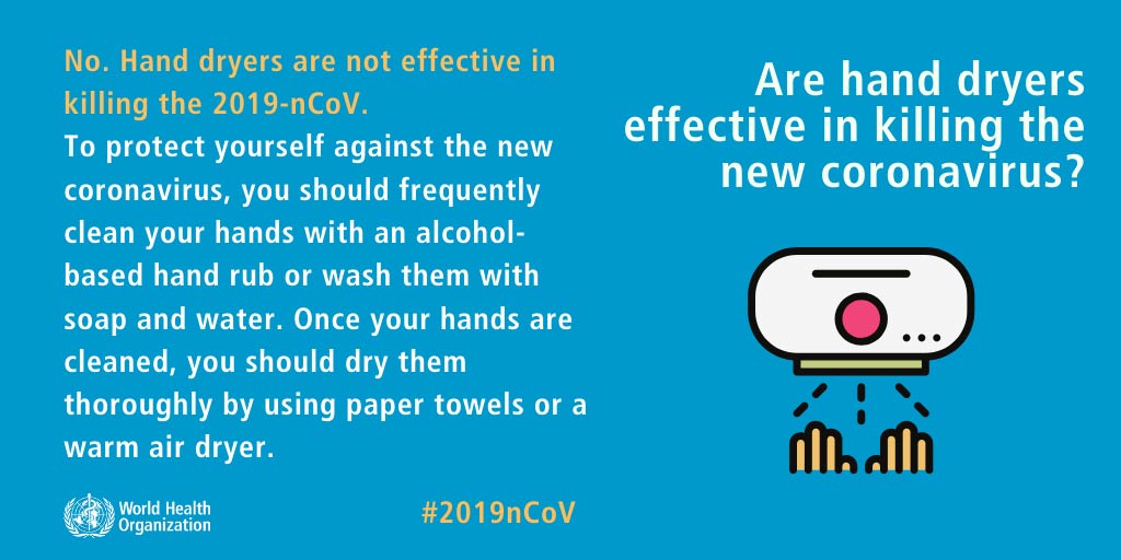 ഹാൻഡ്ഡ്രൈയേർസും അൾട്രവയലറ്റ് ലാമ്പുകളും കൊറോണയെ കൊല്ലുമെന്നതായിരുന്നു മറ്റൊരു പ്രചരണം. ഇവ വൈറസിനെ നശിപ്പിക്കുമെന്നതിൽ യാതൊരു അടിസ്ഥാനവുമില്ല. അൾട്ര വയലറ്റ് റേഡിയേഷന് അണുവിമുക്തമാക്കാൻ കഴിവില്ലെങ്കിലും കൈകൾക്ക് അലർജി വരുത്താനുള്ള കഴിവുണ്ടെന്ന് മറക്കരുതെന്ന് ലോകാരോഗ്യ സംഘടന ഓർമപ്പെടുത്തുന്നു.