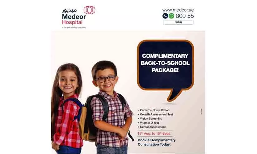 Medeor Hospital-ൽ ഇപ്പോൾ ഒരുമാസ കാലയളവിലേക്ക് ബാക്ക് ടു സ്കൂൾ പാക്കേജ് നൽകുന്നുണ്ട് ( കണ്ണ് പരിശോധന, പല്ല് പരിശോധന &വൈറ്റമിൻ ഡി ബ്ലഡ് ടെസ്റ്റ് ചെയ്തുകൊണ്ടുള്ള വളർച്ച വിലയിരുത്തൽ എന്നിവയെല്ലാം ഇതിൽ ഉൾപ്പെടും) അതുപോലെത്തന്നെ ഫ്ലൂ വാക്സിനേഷൻ പാക്കേജും ലഭ്യമാണ്.