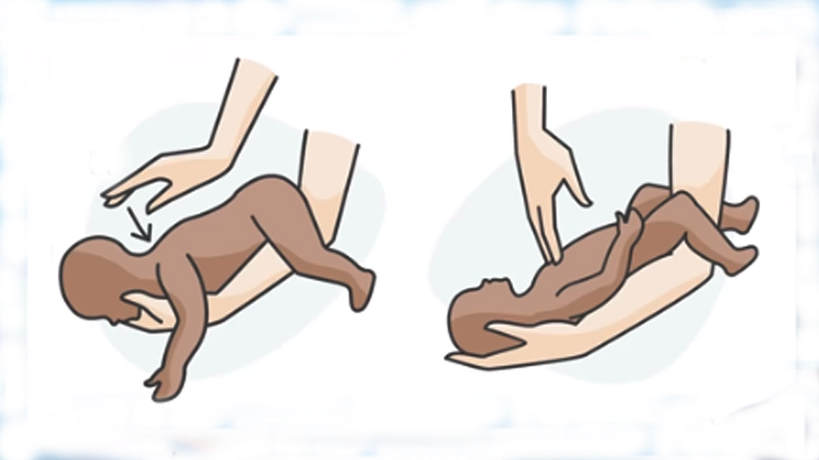 - മൂന്നു വയസ്സിൽ താഴെയുള്ള കുട്ടിയാണെങ്കിൽ കാൽ പൊക്കി തലകീഴായി പിടിക്കുക. ശേഷം പുറത്ത് അടിക്കുക.