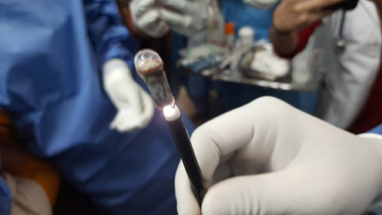 വർഷങ്ങളായി വിട്ടുമാറാത്ത ചുമയുമായി, തളിപ്പറമ്പിലെ ശ്വാസകോശരോഗ വിദഗ്ധൻ ഡോ. ജാഫറിെൻറ ക്ലിനിക്കിൽനിന്ന് റഫർ ചെയ്യപ്പെട്ട് കണ്ണൂർ ഗവ. മെഡിക്കൽ കോളജിലെ ശ്വാസകോശരോഗ വിഭാഗത്തിൽ എത്തിയ രോഗിക്ക് സി.ടി സ്കാൻ പരിശോധനയിലാണ് ശ്വാസനാളിയിൽ അന്യവസ്തു കുടുങ്ങിട്ടുണ്ടെന്ന് സംശയമുദിച്ചത്. ഉടൻ മെഡിക്കൽ കോളജിലെ ശ്വാസകോശരോഗ വിദഗ്ധൻ ഡോ. രാജീവ് റാമിെൻറ നേതൃത്വത്തിലുള്ള ഡോക്ടർമാരും നഴ്സുമാരുമടങ്ങിയ സംഘം ശ്വാസനാളത്തിൽ ട്യൂബ് കടത്തി ബ്രോങ്കോസ്കോപ്പിക്ക് വിധേയയാക്കി.