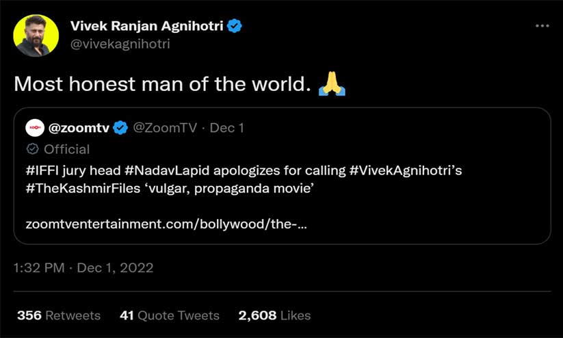 ഇത് പിന്നീട് ഹിന്ദുത്വ പ്രവർത്തകർ ഏറ്റെടുത്തു. എൻ.ഡി ടി.വിയുടെ പേരിൽവരെ വാർത്തകൾ പ്രചരിച്ചു. ആൾട്ട് ന്യൂസിന്റെ പരിശോധനയിൽ സിനിമയെ സംബന്ധിച്ച് ലാപിഡ് ബ്രില്യന്റ് എന്ന് പറഞ്ഞിട്ടില്ലെന്ന് തെളിഞ്ഞു. തന്റെ പരാമർശം ദുരിതബാധിതരുടെ ബന്ധുക്കളെ അപമാനിക്കുന്നതാണെങ്കിൽ അതിൽ ക്ഷമ ചോദിക്കുന്നതായി അദ്ദേഹം പറഞ്ഞു. അദ്ദേഹത്തിന്റെ കൃത്യമായ വാക്കുകൾ ഇതായിരുന്നു: "ഞാൻ ആരെയും അപമാനിക്കാൻ ആഗ്രഹിച്ചില്ല. കഷ്ടത അനുഭവിക്കുന്ന ആളുകളെയോ അവരുടെ ബന്ധുക്കളെയോ അപമാനിക്കുക എന്നതായിരുന്നില്ല എന്റെ ലക്ഷ്യം. അങ്ങനെയാണ് വ്യാഖ്യാനിച്ചതെങ്കിൽ ഞാൻ പൂർണമായും ക്ഷമ ചോദിക്കുന്നു''.