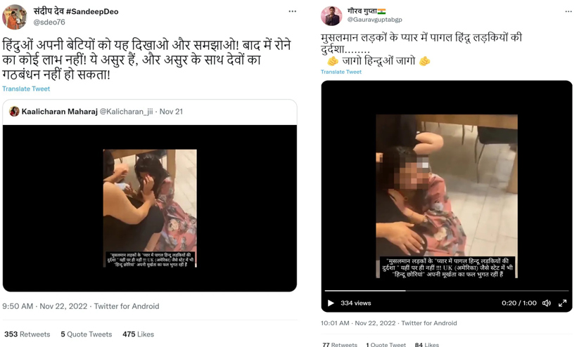 മറ്റൊരു ട്വിറ്റർ ഉപയോക്താവായ സന്ദീപ് ദിയോ ട്വീറ്റ് ഉദ്ധരിച്ച് ഹിന്ദിയിൽ എഴുതി, "ഹിന്ദുക്കളേ, ഇത് നിങ്ങളുടെ പെൺമക്കളെ കാണിച്ച് വിശദീകരിക്കുക! പിന്നീട് കരഞ്ഞിട്ട് കാര്യമില്ല! അവർ അസുരന്മാരാണ്. അസുരന്മാരുമായി ദേവന്മാരുടെ സഖ്യം ഉണ്ടാകില്ല!''. സമാനമായ അടിക്കുറിപ്പുകളോടെ 2022 മെയ് മാസത്തിലും ഈ വീഡിയോ മുമ്പ് സോഷ്യൽ മീഡിയയിൽ വൈറലായിരുന്നു. വീഡിയോ അതിവേഗം ഹിന്ദുത്വ കേന്ദ്രങ്ങളിൽ പ്രചരിച്ചു. ലൗ ജിഹാദിന് ഇരയാക്കപ്പെടുന്ന ഹിന്ദു പെൺകുട്ടികളുടെ ദുരവസ്ഥ എന്ന നിലക്കാണ് വീഡിയോ പ്രചരിപ്പിക്കപ്പെട്ടത്.