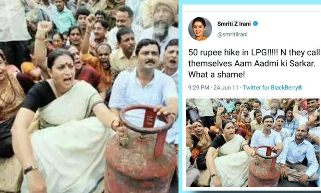 2011ലാണ് ഗാർഹിക പാചകവാതക സിലിണ്ടറിന് മൻമോഹൻ സിംഗ് സർക്കാർ 50 രൂപ വർധിപ്പിച്ചത്. അതിനെതിരെ അന്ന് പ്രതിപക്ഷത്തായിരുന്ന ഇറാനി കടുത്ത വിമർശനം ഉന്നയിക്കുകയും പരസ്യമായി സമരരംഗത്തിറങ്ങുകയും ചെയ്തു. അവശ്യസാധനങ്ങളുടെ വിലക്കയറ്റത്തിനെതിരെ ബിജെപി രാജ്യവ്യാപകമായി ഭാരത് ബന്ദും പ്രഖ്യാപിച്ചിരുന്നു. എന്നാൽ, ഇന്ന് ഗാർഹിക ആവശ്യത്തിനുള്ള സിലിണ്ടറിന് 50 രൂപയും കഴിഞ്ഞ ആഴ്ച വാണിജ്യ സിലിണ്ടറിന് 103 രൂപയുമാണ് ബി.ജെ.പി സർക്കാർ കൂട്ടിയത്. ഇതോടെ 14.2 കിലോയുള്ള ഗാർഹിക സിലിണ്ടറിന് 1,006.50 രൂപയാണ് പുതിയ വില. വാണിജ്യ സിലിണ്ടറിന് കൊച്ചിയിലെ വില 2359 രൂപയായി. നാലു മാസത്തിനിടെ 365 രൂപയാണ് വാണിജ്യ സിലിണ്ടറുകൾക്കു വർധിപ്പിച്ചത്.