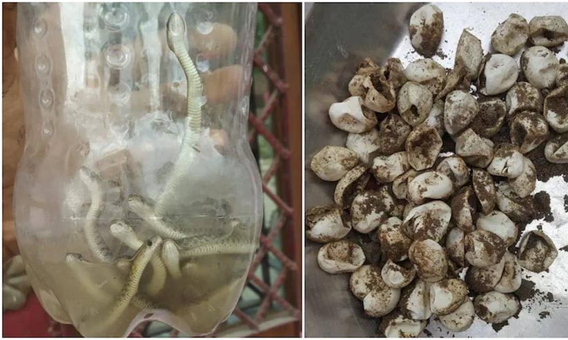 പാമ്പ് പിടിത്തക്കാർ സ്ഥലത്തെത്തി കുളിമുറിയിൽ പരിശോധന നടത്തിയപ്പോഴാണ് ഇവ ഒന്നോ രണ്ടോ മാത്രമല്ല ഒത്തിരിയുണ്ടെന്ന് തിരിച്ചറിഞ്ഞത്. തുടർന്ന് പാമ്പ് പിടിത്ത സംഘം കുളിമുറിയുടെ തറ പൊളിച്ച് പരിശോധിച്ചപ്പോൾ 60തോളം പാമ്പുകളെയും 75ഓളം മുട്ടത്തോടുകളും കണ്ടെത്തി. മണിക്കൂറുകൾ നീണ്ട പരിശ്രമത്തിനൊടുവിൽ മുഴുവൻ പാമ്പുകളെയും പിടികൂടി വനത്തിൽ തുറന്ന് വിട്ടു.