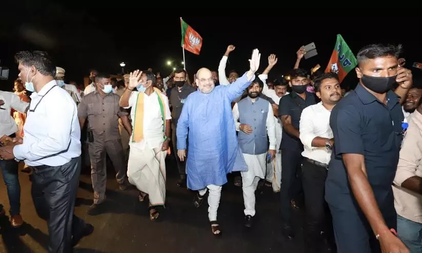 text_fieldsചെന്നൈ: നിയമസഭ തെരഞ്ഞെടുപ്പ് ഒരുക്കങ്ങൾക്കായി കേന്ദ്ര ആഭ്യന്തരമന്ത്രി അമിത് ഷാ തമിഴ്നാട്ടിൽ. ഞായറാഴ്ച രാവിലെ ചെന്നൈ വിമാനത്താളത്തിലെത്തിയ അമിത് ഷായെ ബി.ജെ.പി പ്രവർത്തകർ സ്വീകരിച്ചു. ചെന്നൈ വിമാനത്താവളത്തിൽ വ്യാജ ബോംബ് ഭീഷണിയെ തുടർന്ന് വൻ സുരക്ഷ സന്നാഹം ഒരുക്കിയിരുന്നു. ആഭ്യന്തരമന്ത്രിയുടെ സന്ദർശനത്തിന് തൊട്ടുമുമ്പായിരുന്നു ഫോണിലൂടെ ഭീഷണി സന്ദേശമെത്തിയത്.