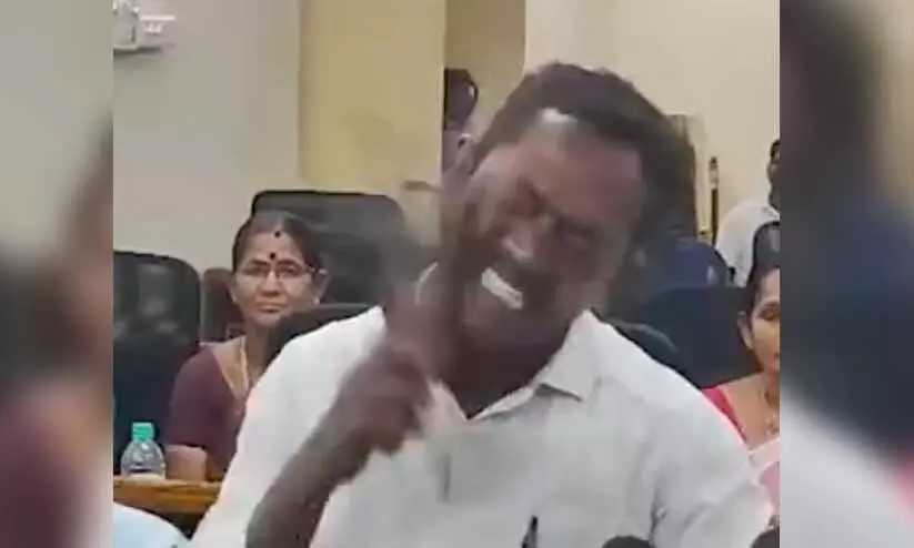 text_fieldsനരസിപട്ടണം (ആന്ധ്രപ്രദേശ്): നരസിപട്ടണം നഗരസഭയിൽ ഇന്നലെ നടന്ന കൗൺസിൽ യോഗം സാക്ഷ്യം വഹിച്ചത് നാടകീയ സംഭവങ്ങൾക്ക്. വാർഡിലെ വികസന പ്രശ്നങ്ങളെ കുറിച്ച് സംസാരിക്കവേ, 20ാം വാർഡ് കൗൺസിലർ മുളപ്പർത്തി രാമരാജു തന്റെ ചെരുപ്പൂരി സ്വന്തം മുഖത്ത് ഇരുകവിളിലും മാറിമാറി അടിച്ച് വികാരധീനനാവുകയായിരുന്നു.