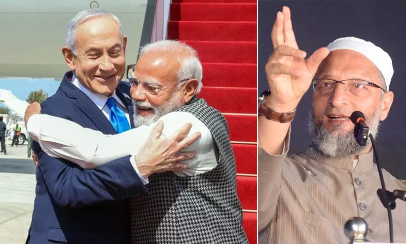text_fieldsഇസ്രായേൽ സ്നദർശന വേളയിൽ നെതന്യാഹുവിലെ ആലിംഗനം ചെയ്യുന്ന പ്രധാനമന്ത്രി മോദി, അസദുദ്ദീൻ ഉവൈസി