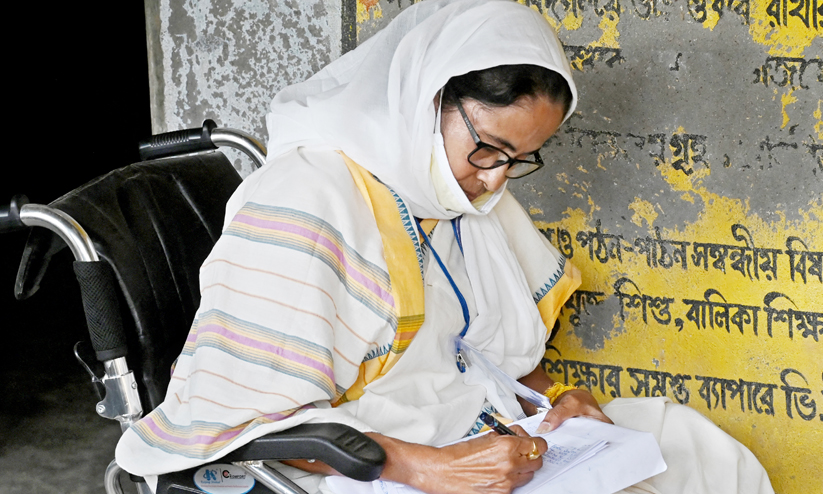 text_fieldsനന്ദിഗ്രാമിലെ ബോയൽ മഖ്തബ് പ്രൈമറി സ്കൂളിലെ ഏഴാം നമ്പർ ബൂത്തിനു മുന്നിൽ വീൽചെയറിലിരിക്കുന്ന ബംഗാൾ മുഖ്യമന്ത്രി മമത ബാനർജി