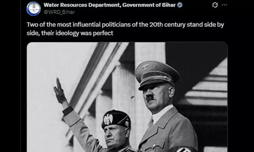 text_fieldsപട്ന: ഇറ്റാലിയൻ ഫാസിസ്റ്റ് ബെനിറ്റോ മുസ്സോളിനിയെയും ജർമൻ സ്വേച്ഛാധിപതിയും നാസി നേതാവുമായ അഡോൾഫ് ഹിറ്റ്ലറെയും പ്രശംസിച്ച് ബിഹാർ സർക്കാർ. ബിഹാർ സംസ്ഥാന ജലവിഭവ വകുപ്പിന്റെ ഔദ്യോഗിക സമൂഹമാധ്യമ പേജിൽ പോസ്റ്റ് ചെയ്ത പോസ്റ്ററിലാണ് പ്രശംസ. കഴിഞ്ഞ ഫെബ്രുവരിയിൽ പ്രസിദ്ധീകരിച്ച പ്രസ്തുത പോസ്റ്റർ മാസങ്ങൾക്കുശേഷം വിവാദത്തിലായി. ഇതോടെ പോസ്റ്റർ പേജിൽനിന്ന് നീക്കുകയും ചെയ്തു.