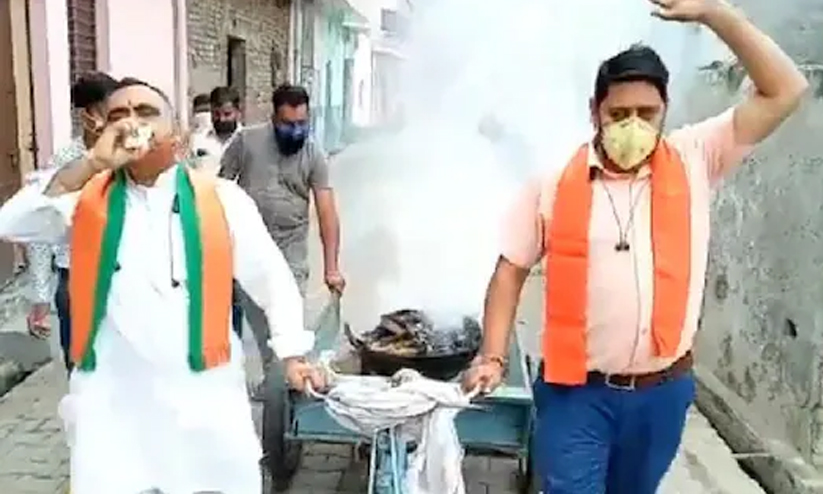 ചാണകവും നെയ്യും കത്തിച്ച പുക, ജയ് ശ്രീറാം വിളികൾ; കോവിഡിനെ നേരിടാൻ പുതിയ 'വിദ്യ'യുമായി ബി.ജെ.പി നേതാവ് VIDEO