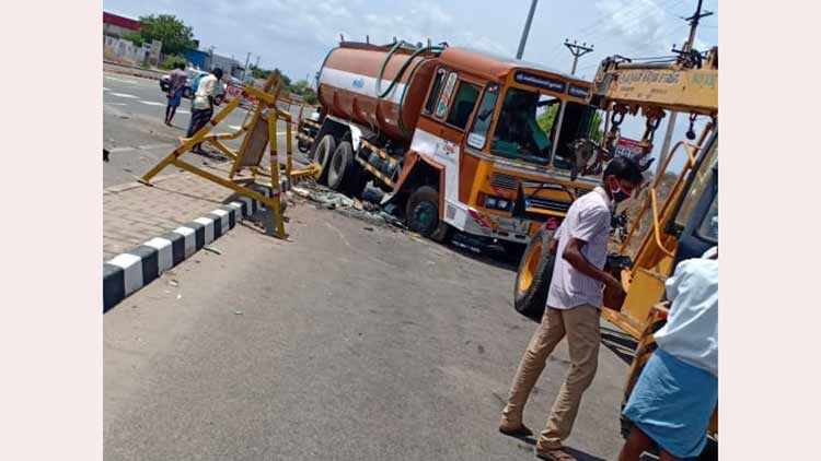 ബംഗളൂരുവിൽ കുടുങ്ങിക്കിടന്ന മലയാളി വിദ്യാർത്ഥികൾ അടങ്ങിയ സംഘം നാട്ടിലേക്ക് വരുന്നതിനിടെ ടാങ്കർ ലോറിയുമായി കൂട്ടിയിടിച്ചാണ് അപകടം. ജയ് ഗുരു എന്ന ബസ് തമിഴ്നാട്ടിലെ കരൂരിൽ വെച്ചാണ് അപകടത്തിൽപ്പെട്ടത്. ഞായറാഴ്ച ഉച്ചക്ക് 12ഓടെയായിരുന്നു സംഭവം. ജീവനക്കാർ അടക്കം 26 പേരാണ് ബസിൽ ഉണ്ടായിരുന്നത്.