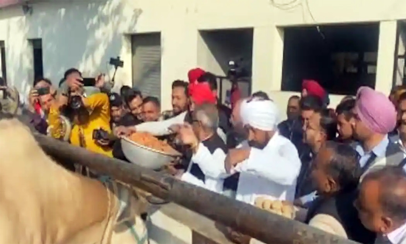 പശുക്കൾക്ക് തീറ്റ നൽകുന്ന ചന്നി; വിഡിയോ വൈറൽ