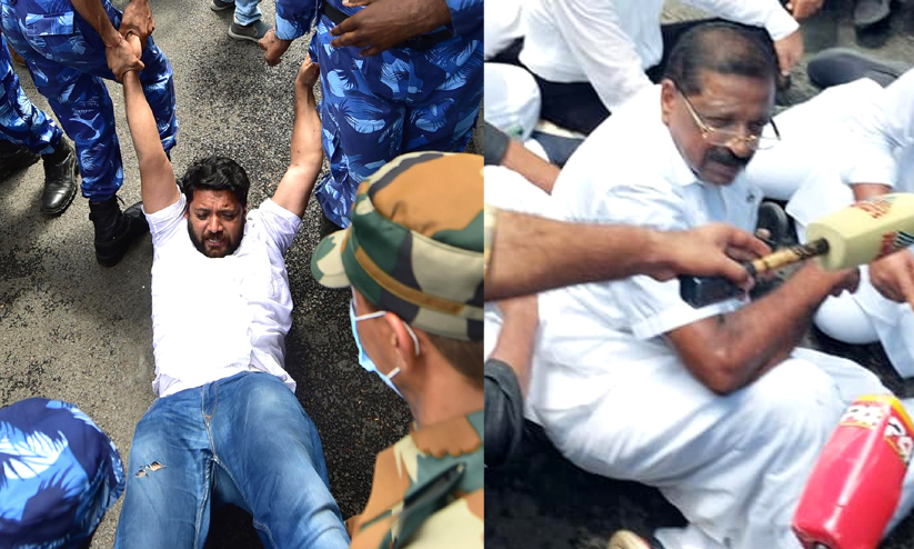 എം.പിമാരായ കെ.സി. വേണുഗോപാൽ, കൊടിക്കുന്നിൽ സുരേഷ് എന്നിവരടക്കം നേതാക്കളെ അറസ്റ്റു ചെയ്തു നീക്കി. പൊലീസിന്റെ ബലപ്രയോഗത്തിനിടയിൽ നിലത്തു തെറിച്ചുവീണ രാജ്മോഹൻ ഉണ്ണിത്താൻ എം.പിയുടെ രണ്ടു കാലിന്റെയും മുട്ട് പൊട്ടി. ഷാഫി പറമ്പിൽ എം.എൽ.എക്ക് പൊലീസിന്റെ മർദനമേറ്റു. ഛത്തിസ്ഗഢ് മുഖ്യമന്ത്രി ഭൂപേഷ് ബാഘേലിനെ പൊലീസ് വലിച്ചിഴച്ചതായും പ്രവർത്തകർ ആരോപിച്ചു. വനിത നേതാവായ അൽക്ക ലാംബയും പൊലീസിന്റെ ബലപ്രയോഗത്തിന് ഇരയായി.