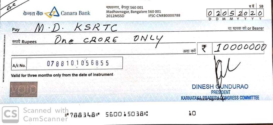 Giving ₹1 crore cheque to KSRTC from the KPCC for ensuring Free Transport to our working class & labour people who are suffering to reach home because of the rates being charged by the Karnataka Govt.