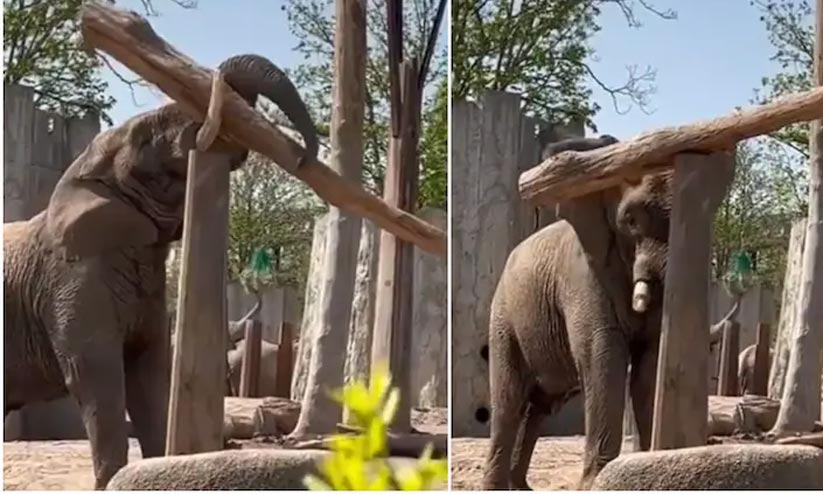 നിസ്സാരം; തൂണിന് മുകളിൽ മരത്തടി "ഫിറ്റ്" ചെയ്യുന്ന ആനയുടെ ദൃശ്യങ്ങൾ കണ്ട് അമ്പരന്ന് നെറ്റിസൺസ്