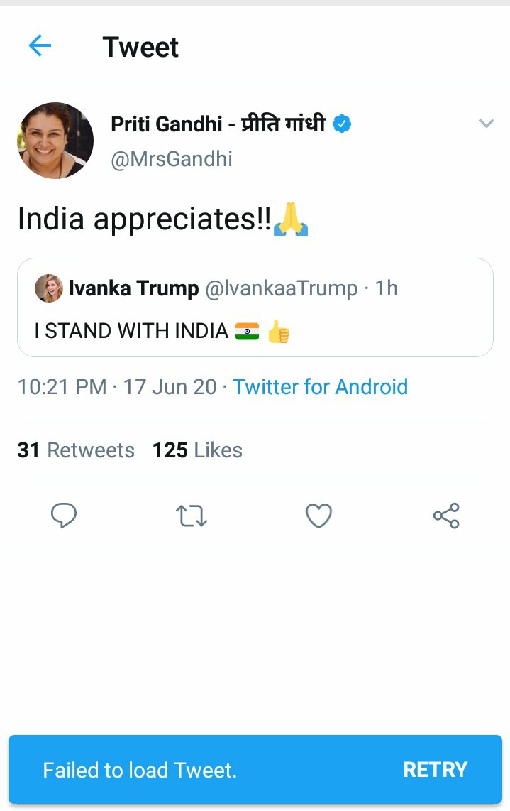 അതിനോടൊപ്പം, ഇന്ത്യക്ക് പൂർണ്ണ പിന്തുണ അറിയിച്ചുകൊണ്ടുള്ള അമേരിക്കൻ പ്രസിഡൻറ് ഡോണൾഡ് ട്രംപ്, മകൻ ഇവാൻക ട്രംപ്, ഇസ്രയേൽ പ്രധാനമന്ത്രി ബെഞ്ചമിൻ നെതന്യാഹു എന്നിവരുടെ ട്വീറ്റുകളും പങ്കുവെക്കുന്നുണ്ട്. എന്നാൽ, എല്ലാം ട്വിറ്റർ വെരിഫൈ ചെയ്യാത്ത വ്യാജ പ്രൊഫൈലുകളിൽ നിന്നുള്ള ട്വീറ്റുകളാണ്. ഇവാൻക് ട്രംപിെൻറ വ്യാജ പ്രൊഫൈലിൽ നിന്നും ഇത്തരത്തിൽ വന്ന ട്വീറ്റിന് ലഭിച്ചത് പതിനായിരക്കണക്കിന് ലൈക്കുകളായിരുന്നു. അതിലേറെ പേർ അത് ഷെയർ ചെയ്യുകയും ചെയ്തിട്ടുണ്ട്. ‘ഞാൻ ഇന്ത്യയോടൊപ്പം നിൽക്കും’ എന്നായിരുന്നു ഇവാൻകയുടെ ട്വീറ്റ്.