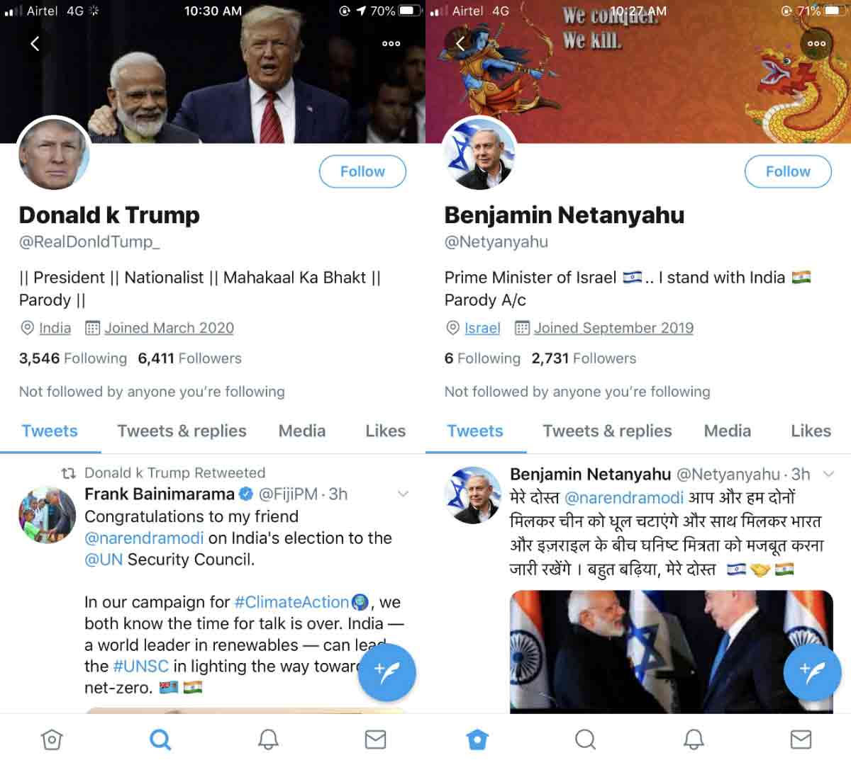 അതിർത്തി പ്രശ്നം: മോദിക്ക് പിന്തുണയുമായി വ്യാജ ട്രംപും നെതന്യാഹുവും ട്വിറ്ററിൽ; പങ്കുവെച്ച് കുടുങ്ങി പ്രമുഖർ