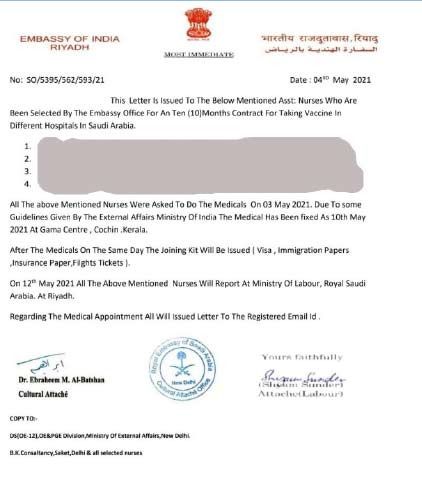 കൊച്ചിയിലെ ഒരു സ്ഥാപനത്തിൽ മെഡിക്കൽ പരിശോധനക്കെത്തണമെന്നും ശേഷം യാത്രക്കൊരുങ്ങാനും ഈ മാസം 12ന് റിയാദിലെ തൊഴിൽ മന്ത്രാലയത്തിൽ റിപ്പോർട്ട് ചെയ്യണമെന്നുമാണ് റിയാദ് ഇന്ത്യൻ എംബസിയുടെ പേരിൽ ഇറക്കിയ കത്തിൽ പറയുന്നത്. ഈ കത്തിൻെറ ആധികാരികതയെ സംബന്ധിച്ച് റിയാദ് ഇന്ത്യൻ എംബസിയുമായി 'ഗൾഫ് മാധ്യമം' ബന്ധപ്പെട്ടപ്പോൾ കത്ത് വ്യാജമാണെന്ന് എംബസി അറിയിച്ചു. നോർക്കയുടെ പ്രതിനിധികൾ എന്ന വ്യാജേനയാണ് ഏജൻറുമാർ നഴ്സുമാരെ ചതിയിൽ പെടുത്തിയിട്ടുള്ളത്. 36,000 രൂപ വീതമാണ് ഓരോരുത്തരിൽനിന്നും ഇവർ കൈപ്പറ്റിയത്. 40ഓളം നഴ്സുമാർ ഇവരുടെ കെണിയിൽ പെട്ടിട്ടുണ്ടെന്നാണ് വിവരം.
