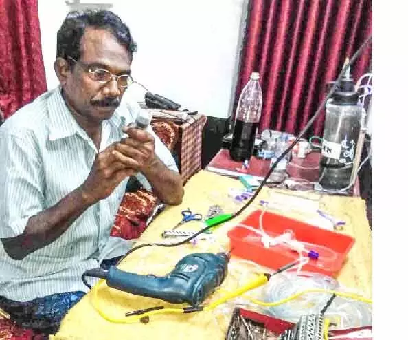 ശ്രീമൂലനഗരം: പ്രാണവായുവിനായി ജനം ഓടി നടക്കുമ്പോള് കുപ്പികളില് കൊണ്ടുനടക്കാവുന്ന ഓക്സിജന് നിർമിച്ച് ശ്രദ്ധേയനാകുകയാണ് ശ്രീമൂലനഗരം സ്വദേശി റിട്ട. മോട്ടോര് വെഹിക്കിള് ഇന്സ്പെക്ടര് എ.കെ. ചന്ദ്രബോസ്. മൂന്ന് മണിക്കൂര് നേരത്തേക്ക് 10,000 എം.എല്. പ്രാണവായുവിന് നിർമാണ ചെലവ് 70 രൂപ മാത്രം.