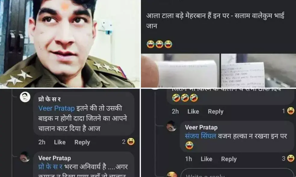 'ജുമുഅ ദിവസമായ ഇന്ന് ഒരു വിശ്വാസിക്കും പിഴ കൊടുക്കരുത് എന്നാണ് രാവിലെ വിചാരിച്ചത്. പക്ഷേ, ട്രാഫിക് ബൂത്തിന്റെ പുറത്ത് ഞാൻ കസേരയിൽ ഇരിക്കുകയായിരുന്നു. അപ്പോൾ തൊപ്പി ധരിച്ച സാജിദ് മിയാൻ എന്നയാൾ ജുമുഅ നിസ്കാരം കഴിഞ്ഞ് ബൈക്കിൽ വന്നു. പിറകിൽ രണ്ടുപേരും കയറിയിരുന്നു. സാജിദ് മിയാന് 33,000 സമ്മാനം കൊടുത്തു. അല്ലാ തആലാ വലിയ കാരുണ്യവാൻ തന്നെ. സലാം അലയ്ക്കും ഭായ്...' - വീർ പ്രതാപ് ഫേസ്ബുക്ക് ഗ്രൂപ്പിൽ കുറിച്ചു. ട്രാഫിക് ചലാന്റെ ഫോട്ടോ സഹിതമായിരുന്നു കുറിപ്പ്.