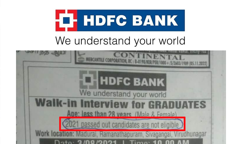 2021 ൽ ബിരുദമെടുത്തവരെ ജോലിക്ക് വേണ്ടെന്ന് എച്ച്.ഡി.എഫ്.സി ബാങ്ക്; വിവാദത്തിന് പിന്നാലെ തിരുത്തി
