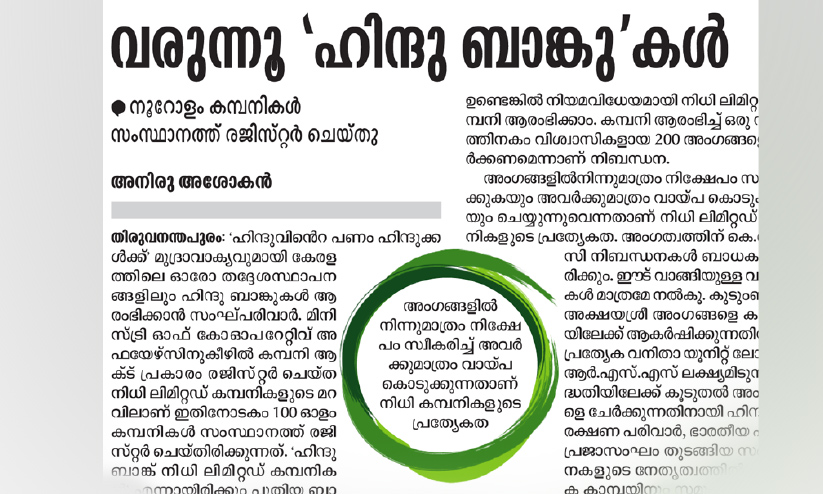 തിരുവനന്തപുരം: തദ്ദേശസ്ഥാപനങ്ങൾ കേന്ദ്രീകരിച്ച് 'ഹിന്ദു ബാങ്കുകൾ' സ്ഥാപിക്കാനുള്ള സംഘ്പരിവാർ നീക്കത്തിനെതിരെ സംസ്ഥാന ഇൻറലിജൻസ് വിഭാഗം അന്വേഷണം ആരംഭിച്ചു. മിനിസ്ട്രി ഓഫ് കോഓപറേറ്റിവ് അഫയേഴ്സിനുകീഴിൽ കമ്പനി ആക്ട് പ്രകാരം രജിസ്റ്റർ ചെയ്ത നിധി ലിമിറ്റഡ് കമ്പനികളുടെ മറവിൽ ആശ്രമങ്ങളും മഠങ്ങളും ക്ഷേത്രങ്ങളും കേന്ദ്രീകരിച്ച് 100 ഓളം കമ്പനികൾ രജിസ്റ്റർ ചെയ്തിരിക്കുന്നത്.