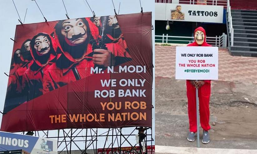 ഞങ്ങള് വെറും ബാങ്ക് കൊള്ളക്കാർ, മോദിയും കൂട്ടരും രാജ്യംതന്നെ കൊള്ളയടിക്കുന്നു; ഹൈദരാബാദിൽ മണിഹീസ്റ്റ് തരംഗം