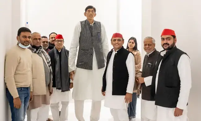 നേരത്തെ ഉത്തർപ്രദേശ് ഭരിച്ചിരുന്ന അഖിലേഷ് യാദവിെൻറ സമാജ്വാദി പാർട്ടിയാണ് വേറിട്ട ഒരു വ്യക്തിയെ പാർട്ടിയിലെത്തിച്ച് വാർത്ത സൃഷ്ടിച്ചത്. രാജ്യത്തെ ഏറ്റവും ഉയരമുള്ളയാളെയാണ് ഇത്തവണ സമാജ്വാദി പാർട്ടി സ്വന്തം പാളയത്തിലെത്തിച്ചരിക്കുന്നത്. രാജ്യത്തെ ഏറ്റവും ഉയരം കൂടിയ മനുഷ്യനായ ധർമേന്ദ്ര പ്രതാഭ് സിംഗാണ് കഴിഞ്ഞ ദിവസം സമാജ് വാദി പാർട്ടിയിൽ ചേർന്നത്. സമാജ്വാദി പാർട്ടി സംസ്ഥാന പ്രസിഡൻറ് നരേഷ് പട്ടേലാണ് ഇദ്ദേഹത്തിെൻറ പാർട്ടി പ്രവേശം പ്രഖ്യാപിച്ചത്. സമാജ്വാദി പാർട്ടി അധ്യക്ഷൻ അഖിലേഷ് യാദവിെൻറയും സംസ്ഥാന നേതാക്കളുടേയും സാന്നിധ്യത്തിലാണ് ധർമേന്ദ്ര പ്രതാഭ് സിംഗ് പാർട്ടിയിൽ അംഗത്വമെടുത്തത്. ഉത്തർ പ്രദേശിലെ പ്രതാഭ് ഘട്ട് സ്വദേശിയാണ് ധർമേന്ദ്ര പ്രതാഭ് സിംഗ്.