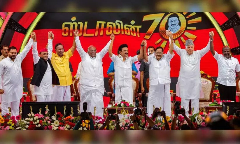 text_fieldsജന്മദിനം ആഘോഷിക്കുന്ന തമിഴ്നാട് മുഖ്യമന്ത്രി എം.കെ. സ്റ്റാലിനൊപ്പം പ്രതിപക്ഷ നേതാക്കളായ തേജസ്വി യാദവ്, അഖിലേഷ് യാദവ്, ടി.ആർ. ബാലു മല്ലികാർജുൻ ഖാർഗെ, ഫാറൂഖ് അബ്ദുല്ല തുടങ്ങിയവർ
