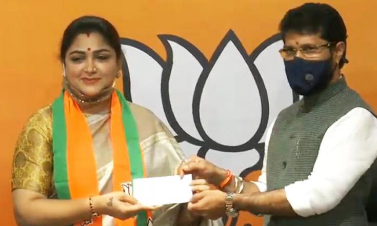 ബി.ജെ.പിയിൽ ചേരുന്നില്ലെന്ന് പ്രഖ്യാപിച്ചിരുന്ന ഖുശ്ബു ഇന്ന് ന്യൂഡൽഹിയിലെത്തി സമ്പിത് പാത്രയുടെയും മറ്റ് ബി.ജെ.പി നേതാക്കളുടെയും സാന്നിധ്യത്തിലാണ് ബി.ജെ.പിയിൽ ചേർന്നത്. ഖുശ്ബുവിെൻറ ബി.ജെ.പി പ്രവേശനം ഉറപ്പായ കോൺഗ്രസ് പാർട്ടി വക്താവ് സ്ഥാനത്ത് നിന്നും നീക്കിയിരുന്നു. ഡി.എം.കെ വിട്ട് 2014ലാണ് ഖുശ്ബു കോൺഗ്രസിൽ ചേർന്നത്.