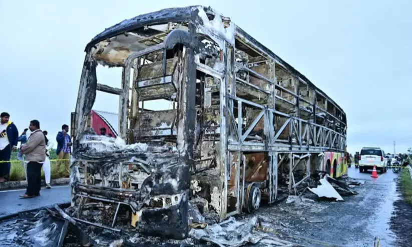 text_fieldsബംഗളൂരു: ആന്ധ്രയിലെ കുർണൂലിൽ ബസ് കത്തി 19 യാത്രക്കാരുടെ ജീവൻ നഷ്ടപ്പെട്ട സംഭവത്തിൽ അപകടത്തിനു വഴിവെച്ച ബൈക്കിൽ സഞ്ചരിച്ചിരുന്ന രണ്ടുപേരും നന്നായി മദ്യപിച്ചിരുന്നതായി സ്ഥിരീകരിച്ച് ആന്ധ്രാപ്രദേശ് പൊലീസ്.