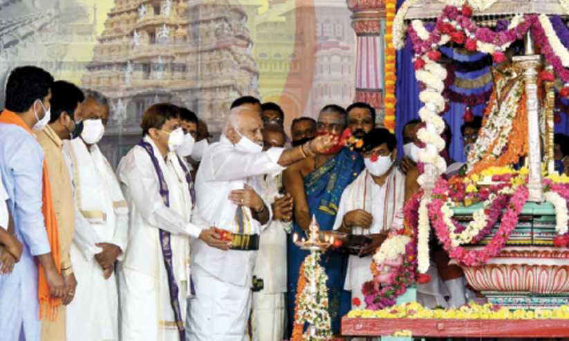മൈസൂരു ദസറ ഉദ്ഘാടനം ചെയ്തശേഷം ചാമുണ്ഡേശ്വരി ദേവിക്ക് പുഷ്പം സമർപ്പിക്കുന്നു