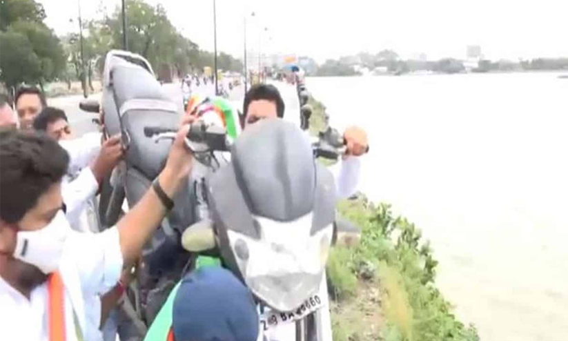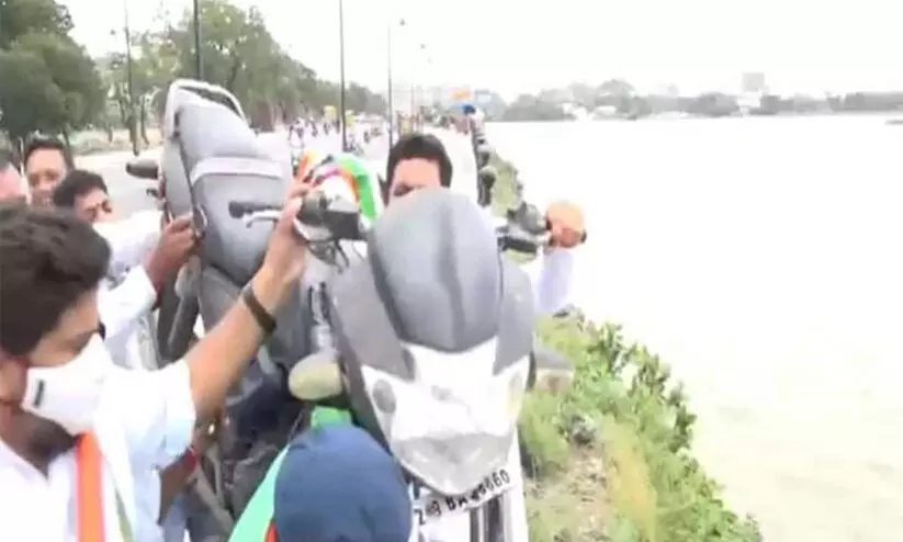text_fieldsഹൈദരാബാദ്: ഇന്ധന വിലവർധനവിൽ പ്രതിഷേധിച്ച് തെലങ്കാനയിൽ യൂത്ത് കോൺഗ്രസ് പ്രവർത്തകർ ബൈക്ക് ഹുസൈൻ സാഗർ തടാകത്തിൽ എറിഞ്ഞു. രാജ്യത്ത് പെട്രോളിയം, എൽ.പി.ജി വില കുറക്കണമെന്നാവശ്യപ്പെട്ടായിരുന്നു പ്രതിഷേധം.