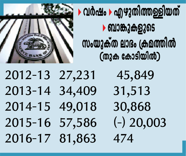 2012-13 സാമ്പത്തിക വർഷത്തിൽ പൊതുമേഖല ബാങ്കുകളുടെ സംയുക്ത അറ്റാദായം 45,849 കോടിയായിരുന്നപ്പോൾ 27,231 കോടിയാണ് എഴുതിത്തള്ളിയതെങ്കിൽ 2016-17ൽ ബാങ്കുകളുടെ സംയുക്ത ലാഭം വെറും 474 കോടിയിൽ നിൽക്കുേമ്പാഴാണ് 80,000 കോടിയിലേറെ എഴുതിത്തള്ളിയിരിക്കുന്നത്. കഴിഞ്ഞ അഞ്ചുവർഷവും തുടർച്ചയായി കിട്ടാക്കടം പെരുകുന്നതിനൊപ്പം ഇതേ കാലയളവിൽ ബാങ്കുകളുടെ ലാഭത്തിലും തുടർച്ചയായ ഇടിവാണ് രേഖപ്പെടുത്തിയിരിക്കുന്നത്. ബാങ്ക് വായ്പകളുടെ ഗുണശേഷി സംബന്ധിച്ച് റിസർവ് ബാങ്ക് മൂല്യനിർണയം ശക്തിപ്പെടുത്തിയതാണ് കിട്ടാക്കടം കൂടുതൽ വെളിപ്പെടുത്താൻ ബാങ്കുകളെ പ്രേരിപ്പിക്കുന്ന ഘടകം. കഴിഞ്ഞ അഞ്ചുവർഷത്തിനിടെ 2.46 ലക്ഷം കോടിയുടെ വായ്പയാണ് ബാങ്കുകൾ എഴുതിത്തള്ളിയിരിക്കുന്നതെന്നും ധനമന്ത്രാലയ രേഖകൾ വെളിപ്പെടുത്തുന്നു.