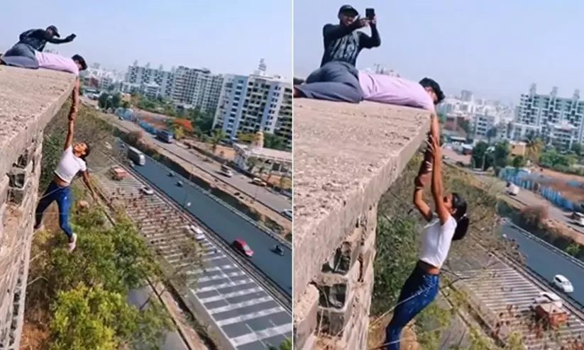 text_fieldsപുണെ: മഹാരാഷ്ട്രയിലെ പുണെയിൽ ബഹുനില കെട്ടിടത്തിൽ അപകടകരമായി തൂങ്ങിക്കിടന്ന് റീൽ ചിത്രീകരിച്ച യുവതിയും സുഹൃത്തും അറസ്റ്റിൽ. പുണെ സ്വദേശിനി മിനാക്ഷി സാലുങ്കെ (23), ആൺ സുഹൃത്തായ മിഹിർ ഗാന്ധി (27) എന്നിവരെ ഭാരതി വിദ്യാപീഠ് പൊലീസാണ് വെള്ളിയാഴ്ച അറസ്റ്റ് ചെയ്തത്. റീൽ ചിത്രീകരിച്ച മൂന്നാമനെ ഇതുവരെ കണ്ടെത്താനായിട്ടില്ല.