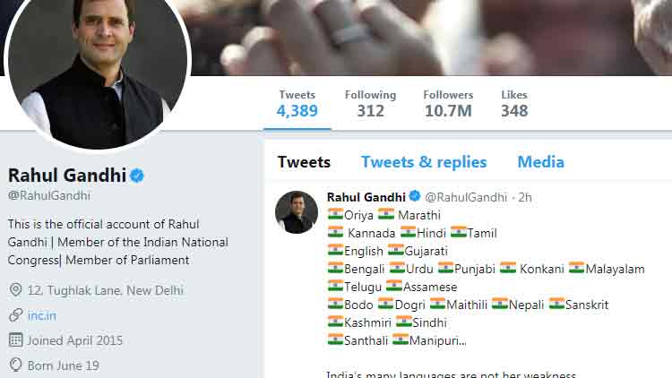 ഒറിയ, മറാത്തി, കന്നഡ, ഹിന്ദി, തമിഴ്, ഇംഗ്ലീഷ ്, ഗുജറാത്തി, ബംഗാളി, ഉറുദു, പഞ്ചാബി എന്നിങ്ങനെ ഇന്ത്യയില് നിലനില്ക്കുന്ന 23 ഭാഷകളെ ഉദ്ധരിച്ചുകൊണ്ടായിരുന്നു രാഹുലിന്റെ ട്വീറ്റ്. ഭാഷകളൊന്നും ഇന്ത്യയുടെ ദൗര്ബല്യമല്ല കാണിക്കുന്നതെന്നും അദ്ദേഹം ട്വീറ്റില് കുറിച്ചു.