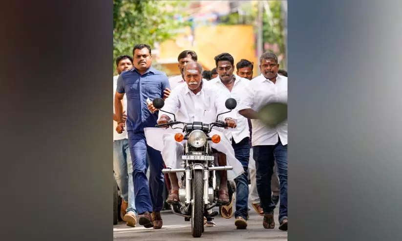 text_fieldsപുതുച്ചേരിയിലെ പോളിങ് സ്റ്റേഷനിൽ വോട്ട് രേഖപ്പെടുത്തിയ ശേഷം മുഖ്യമന്ത്രി എൻ.രംഗസാമി മോട്ടോർ സൈക്കിളിൽ പോകുന്നു