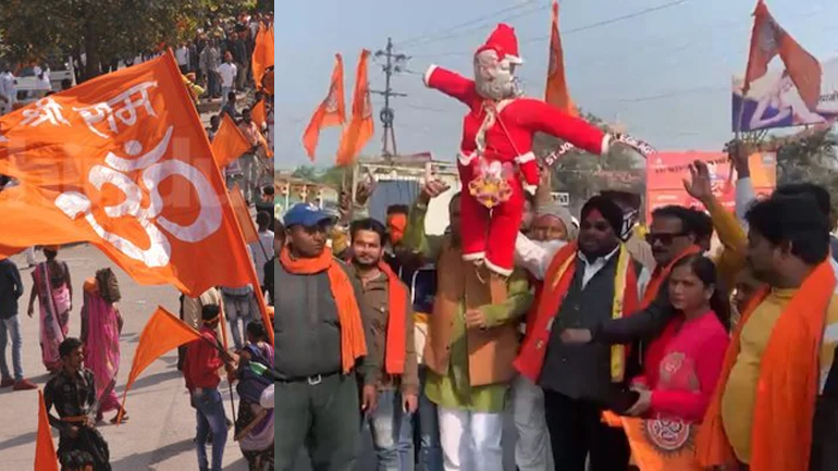 യു.പിയിൽ ക്രിസ്മസിനിടെ തീവ്ര ഹിന്ദുത്വസംഘം സാന്താ ക്ലോസിന്റെ കോലം കത്തിച്ചു; മതപരിവർത്തനത്തിനുള്ള തന്ത്രമാണ് ആഘോഷമെന്ന് ആരോപണം