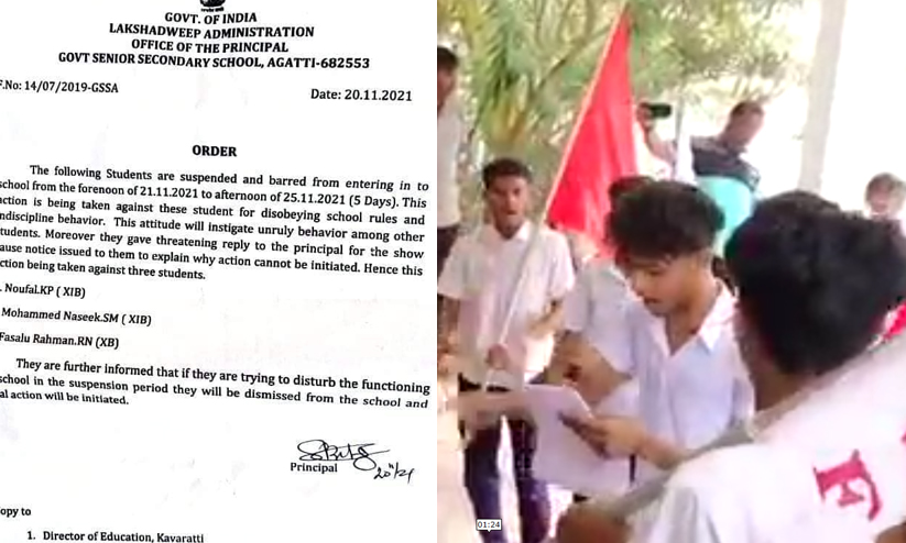 സ്കോളർഷിപ്പ് നിരോധനം: ലക്ഷദ്വീപിൽ സമരം ചെയ്ത വിദ്യാർഥികൾക്ക് സസ്പെൻഷൻ