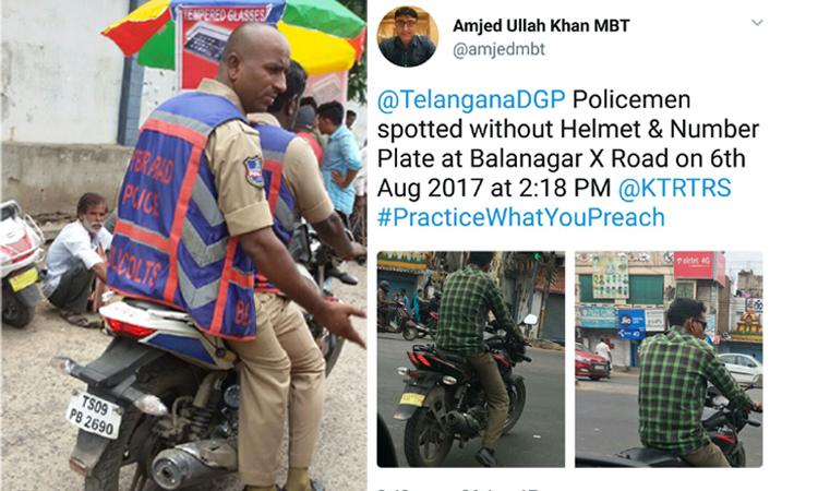 ഹൈദരാബാദ് കേന്ദ്രീകരിച്ച് പ്രവർത്തിക്കുന്ന മജ്ലിസ് ബചാവോ തെഹ്രീക് (എം.ബി.ടി) എന്ന രാഷ്ട്രീയ പാർട്ടിയുടെ നേതാവ് അംജദുല്ലാ ഖാനാണ് ഇൗ സോഷ്യൽ മീഡിയ കാമ്പയിനു പിന്നിൽ. പൊലീസുകാർ ഹെൽമെറ്റില്ലാതെ ബൈക്കിൽ യാത്ര ചെയ്യുന്നതും യാത്രക്കിടയിൽ അവർ മൊബൈൽ ഫോൺ ഉപയോഗിക്കുന്നതും നിയമം ലംഘിച്ച് പൊലീസ് വാഹനങ്ങൾ പാർക്ക് ചെയ്തിരുക്കുന്നതുമായ ചിത്രങ്ങൾ ഖാൻ ട്വീറ്റ് ചെയ്യാൻ തുടങ്ങിയതോടെയാണ് അതൊരു കാമ്പയിനായി മാറിയത്. തെലങ്കാന ഡി.ജി.പി അനുരാഗ് ശർമയെ സംബോധന ചെയ്തുകൊണ്ടായിരുന്നു അംജദുല്ലാ ഖാൻറെ ട്വിറ്റർ ബോംബുകൾ.