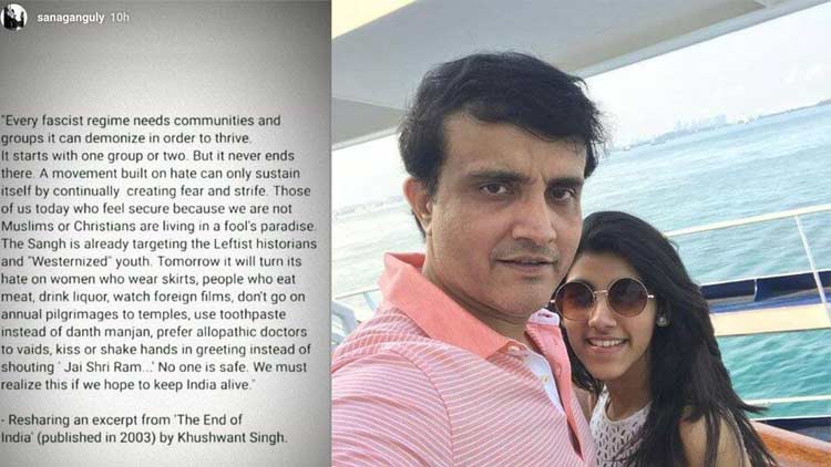 text_fieldsന്യൂഡൽഹി: പൗരത്വ ഭേദഗതി നിയമത്തിനെതിരെ ഇൻസ്റ്റഗ്രാമിലൂടെ പ്രതിഷേധം പ്രകടിപ്പിച്ച് ബി.സി.സി.ഐ അധ്യക്ഷനും മുൻ ഇന്ത്യൻ ക്യാപ്റ്റനുമായ സൗരവ് ഗാംഗുലിയുടെ മകൾ സന ഗാംഗുലി. ഖുശ്വന്ത് സിങ്ങിെൻറ ‘ദി എൻറ് ഓഫ് ഇന്ത്യ’ എന്ന പുസ്തകത്തിലെ പേജ് തെൻറ ഇൻസ്റ്റഗ്രാം സ്റ്റോറിയായി പോസ്റ്റ് ചെയ്തുകൊണ്ടാണ് സന പ്രതിഷേധം രേഖപ്പെടുത്തിയത്.