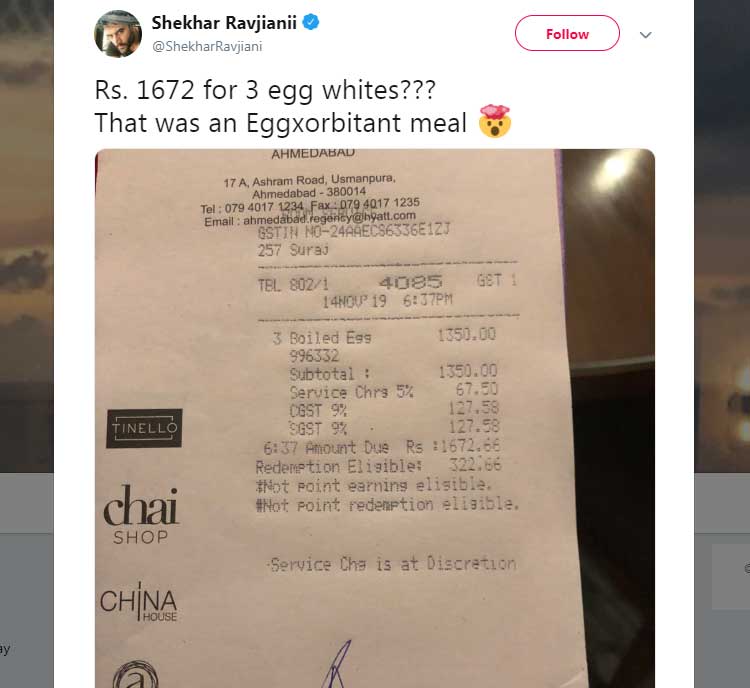 അഹമ്മദാബാദ്: പുഴുങ്ങിയ മൂന്ന് മുട്ട വാങ്ങി കഴിച്ചതിന് തന്ന ബിൽ കണ്ട് ബോളിവുഡ് സംവിധായകൻ ശേഖർ രവ്ജിയാനിയുടെ ക ണ്ണ് തള്ളി. മൂന്ന് മുട്ടക്ക് 1672 രൂപ!