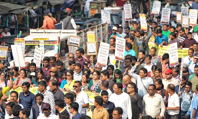 text_fieldsകൊൽക്കത്ത: ബംഗാൾ ഉൾപ്പെടെ രാജ്യത്തുടനീളം നടക്കുന്ന വോട്ടർ പട്ടികയുടെ പ്രത്യേക തീവ്ര പരിഷ്കരണത്തിലെ (എസ്.ഐ.ആർ) അമിതമായ ജോലി സമ്മർദവും വീഴ്ചകളും ആരോപിച്ച് നൂറുകണക്കിന് ബൂത്ത് ലെവൽ ഓഫിസർമാർ (ബി.എൽ.ഒമാർ) കൊൽക്കത്തയിലെ തെരുവുകളിൽ മാർച്ച് നടത്തി.