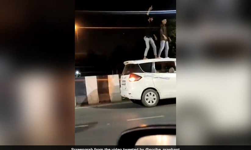 തിരക്കേറിയ ഡൽഹി-മീററ്റ് എക്സ്പ്രസ് വേയിലാണ് യുവാക്കളുടെ സാഹസികത നിറഞ്ഞ അഭ്യാസം. റോഡിലൂടെ പതുക്കെ നീങ്ങി കൊണ്ടിരിക്കുന്ന കാറിന് മുകളിൽ കയറി നിന്ന് രണ്ട് യുവാക്കൾ നൃത്തം ചെയ്യുന്നതാണ് ദൃശ്യങ്ങളിൽ.