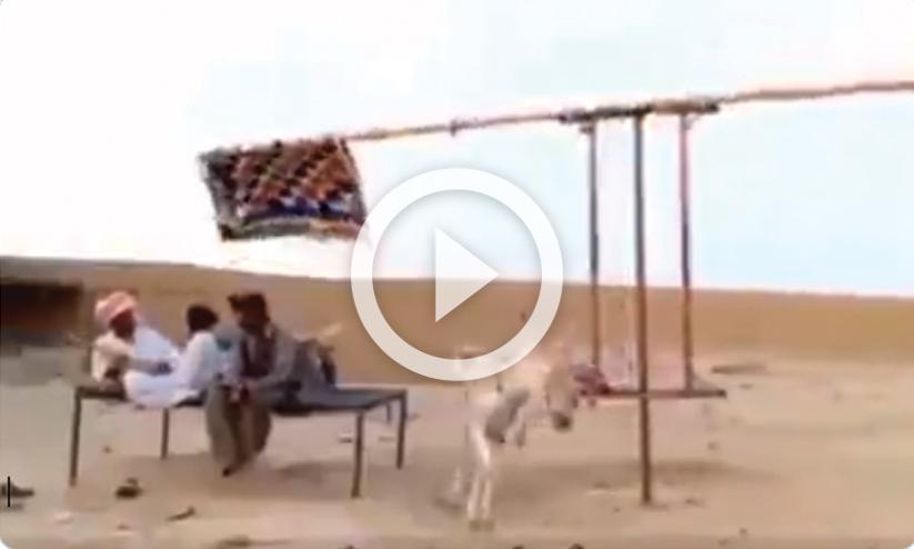 മരങ്ങളൊന്നുമില്ലാതെ, മരുഭൂമിക്ക് സമാനമായ പ്രദേശത്ത് ഒരു കട്ടിലിൽ വിശ്രമിക്കുന്ന മൂന്ന് ഗ്രാമീണരാണ് വിഡിയോയിൽ. അവരുടെ തലക്ക് മുകളിലായി ഉയർത്തിക്കെട്ടിയ ഒരു കമ്പിന്റെ ഇരു ഭാഗത്തും ഒാരോ തുണികൾ കെട്ടിയിട്ടിട്ടുണ്ട്.