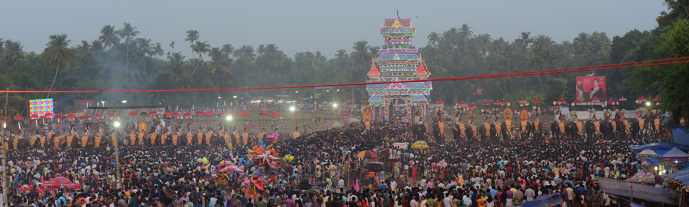 ഒന്നരക്കാണ് പ്രശസ്തമായ ഇലഞ്ഞിത്തറമേളം. മേളകുലപതികള് പെരുവനം കുട്ടന്മാരാരും ചോറ്റാനിക്കര വിജയന് മാരാരും പാണ്ടി മേളത്തിന് നേതൃത്വം നൽകും. വൈകീട്ട് അഞ്ചിന് തെക്കേ ഗോപുരം കടന്ന് പാറമേക്കാവ്, തിരുവമ്പാടി ഭഗവതിമാര് മുഖാമുഖം നിന്ന് വര്ണക്കുടകള് ഉയര്ത്തും. തിരുവമ്പാടി ഭഗവതിയുടെ തിടമ്പ് ശിവസുന്ദറും പാറമേക്കാവിന്റേത് ലക്ഷണമൊത്ത ശ്രീപത്മനാഭനും ഏറ്റും. കുടമാറ്റം കഴിയുമ്പോഴേക്കും രാത്രി പൂരത്തിന് തുടക്കമാകും. ഘടക പൂരങ്ങളെല്ലാം വീണ്ടും വടക്കുന്നാഥനില് എത്തും. ഇവിടെ പാറമേക്കാവിന്റെ രാത്രി പഞ്ചവാദ്യം അരങ്ങേറും.