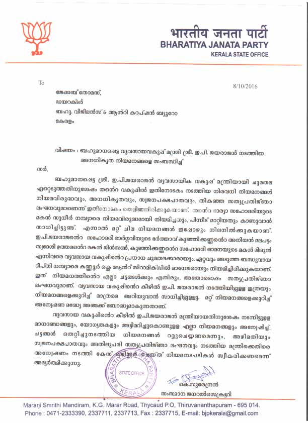 ജയരാജന്െറ ഭാര്യാസഹോദരിയും കണ്ണൂര് എം.പിയുമായ പി.കെ. ശ്രീമതിയുടെ മകനായ സുധീര് നമ്പ്യാരെ കെ.എസ്.ഐ.ഇ എം.ഡിയായി നിയമിച്ച് ഉത്തരവിറങ്ങിയിരുന്നു. ഇത് വൻ വിവാദമായതോടെ ഉത്തരവ് വ്യവസായ വകുപ്പ് പിൻവലിക്കുകയും ചെയ്തിരുന്നു. നിയമനവിവാദത്തെ കുറിച്ച് തനിക്ക് ഒന്നും അറിയില്ലെന്നായിരുന്നു വ്യവസായ മന്ത്രി ഇപി ജയരാജെൻറ പ്രതികരണം. ആരോപണങ്ങള് ഉന്നയിക്കുന്നവര് ഉന്നയിക്കട്ടെ. എല്ലാ ആരോപണങ്ങള്ക്കും അവസാനം മറുപടി പറയും. ആരോപണം ഉന്നയിക്കുന്നവരുടെ പേരുകള് താന് കേട്ടിട്ട് പോലുമില്ലെന്നും ജയരാജന് കൊച്ചിയില് പറഞ്ഞു.