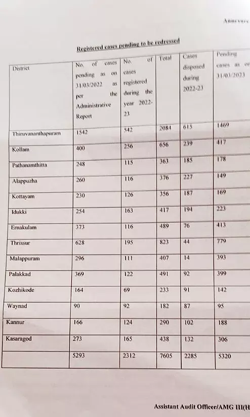 ഏറ്റവുമധികം കേസുകൾ തീർപ്പുകൽപ്പിക്കാനുള്ളത് തിരിവനന്തപുരത്താണ്. 1469 എണ്ണം. ഏറ്റവും കുറവ് വയനാട്ടിലുമാണ്. 95 കേസുകളാണ് വയനാട്ടിലുള്ളത്. 5320 കേസുകളിൽ 3008 എണ്ണം മുൻ വർഷങ്ങളിൽ രജിസ്റ്റർ ചെയ്തവയാണ്. ഓപ്പണിങ് ബാലൻസും ക്ലോസിങ് ബാലൻസും ഉള്ള രജിസ്റ്ററുകൾ പരിപാലിക്കാത്തതിനാൽ വർഷാടിസ്ഥാനത്തിലുള്ള ബ്രേക്കപ്പുകൾ നൽകാൻ കമീഷന് കഴിഞ്ഞില്ല. വിവിധ ജില്ലകളിലെ കേസുകൾ