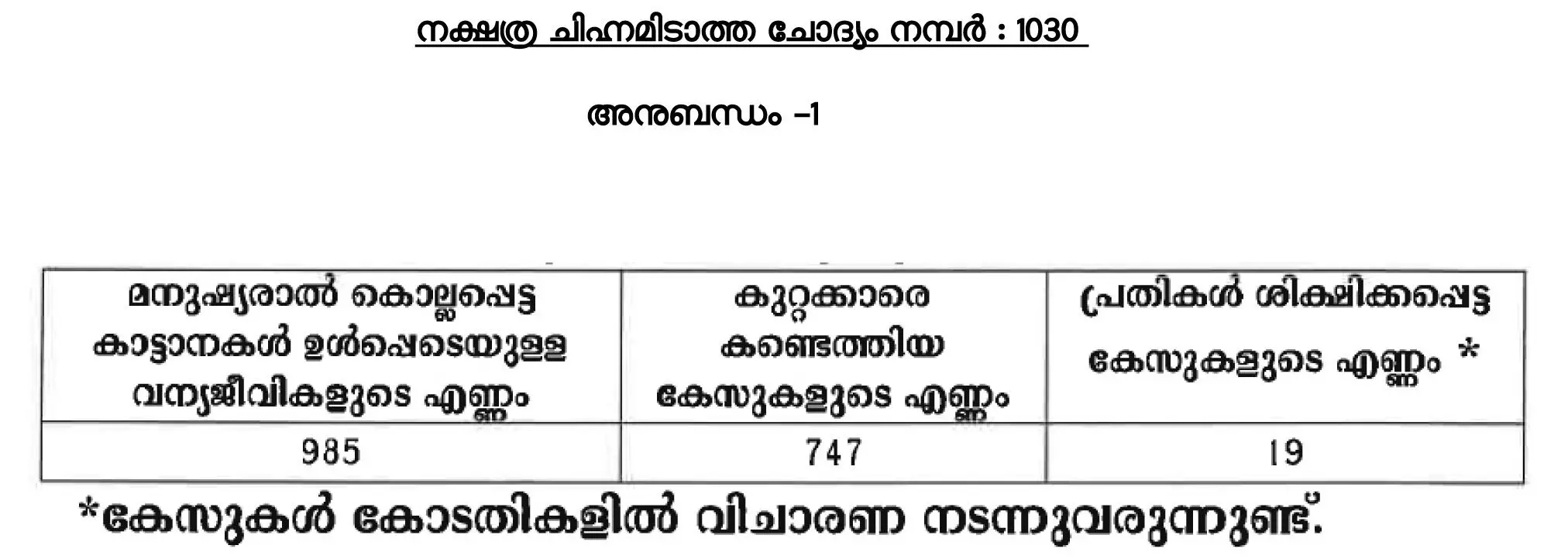 date_range 20 Aug 2023 8:15 PM ISTകാട്ടാനകൾ ഉൾപ്പെടെയുള്ള 985 വന്യജീവികൾ മനുഷ്യരാൽ കൊല്ലപ്പെട്ടു